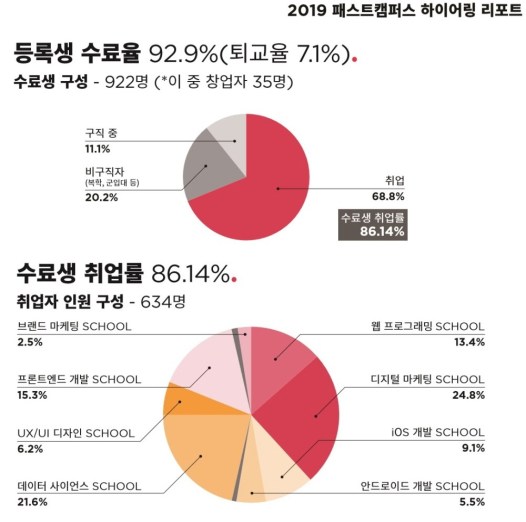 패스트캠퍼스가 누적 커리어전환 코스 992명 수료생 취업과 창업 결과를 분석한 하이어링 리포트 2019를 발표했다.
