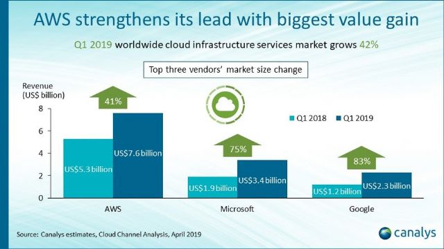 캐널리스에 따르면 올해 1분기 세계 클라우드 인프라 서비스 시장 규모는 전년 동기 대비 42% 증가했다.
