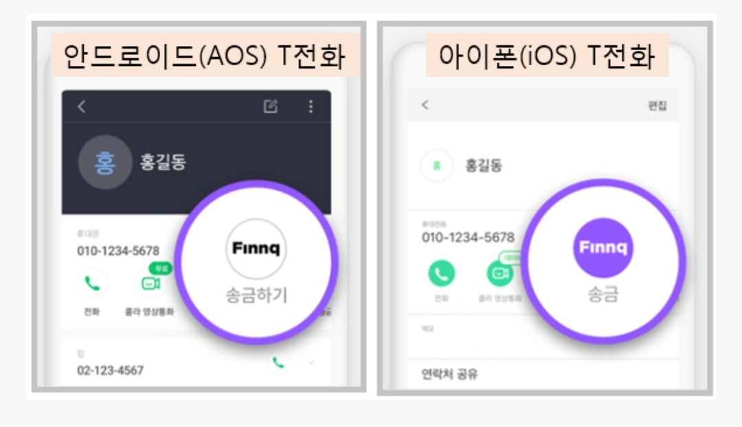 T전화송금 서비스는 사용법은 간단하다. 핀크 앱을 먼저 내려받고 T전화 최신 버전으로 업데이트 하면 안드로이드와 iOS 상관없이 사용할 수 있다. T전화 연락처에 저장된 특정 인물을 선택한 뒤 영상통화, 문자와 같은 T전화 부가 기능 중 ‘송금하기’ 버튼을 누르면, 받는 사람의 이름과 연락처가 핀크 앱 무료송금 화면에 자동으로 기입된다.
