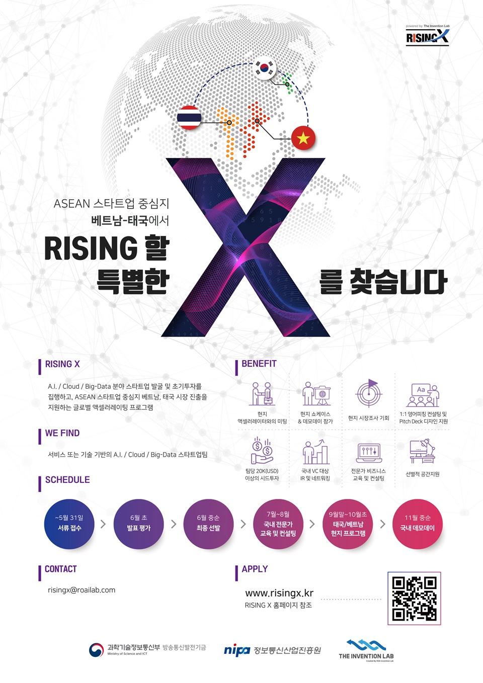 스타트업 액셀러레이팅 전문기관 로아인벤션랩(대표이사 김진영)이 작년에 이어 A.I. / Cloud / Bigdata 등 기술 스타트업의 베트남, 태국 해외 진출을 지원하는 글로벌 액셀러레이팅 프로그램 RISING X 2기를 모집한다. RISING X는 아시아 신흥 시장 베트남, 태국 진출을 지원하는 프로그램이다.