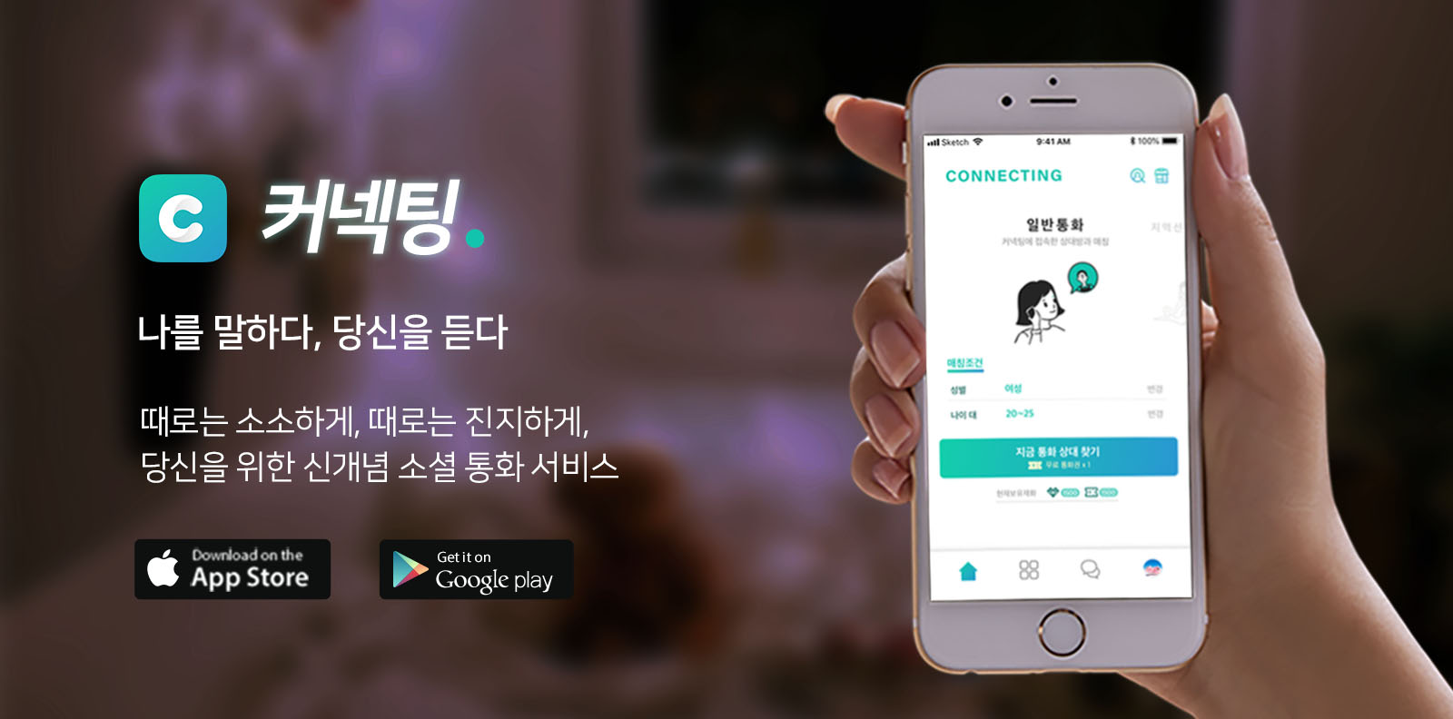 커넥팅은 취향, 성향이 잘 맞는 사람을 실시간으로 매칭시켜주는 소셜 통화 플랫폼으로 온라인 소비 욕구가 강하고 다양한 채널에서 사람과의 관계를 만들어 가는 밀레니얼 세대를 타겟으로 한다.