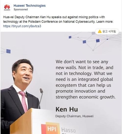 삭제된 광고 중 하나는 "우리는 새로운 장벽을 보고 싶지 않다. 무역이나 기술에서 그렇다. 우리가 필요한 것은 통합된 글로벌 생태계다"라는 후허우쿤 화웨이 부회장의 발언이 인용됐다.
