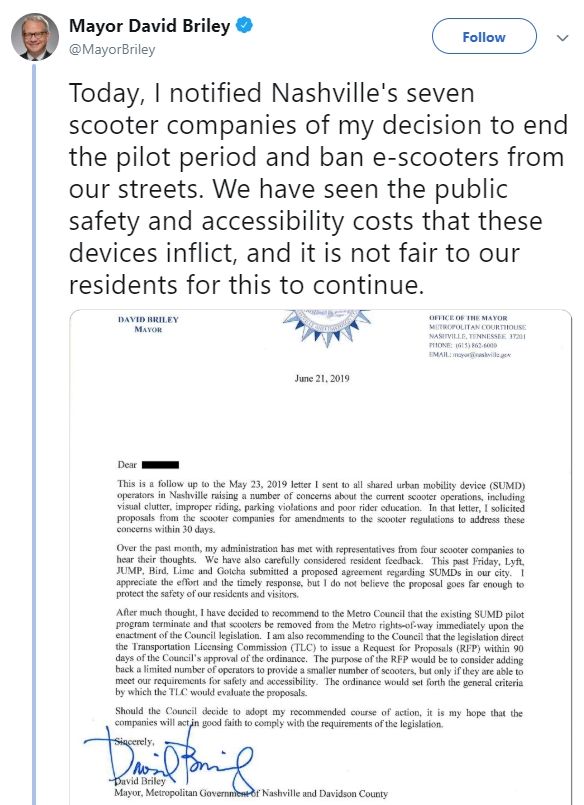 24일(현지시간) 쿼츠 등 복수 외신에 따르면 데이빗 브라일리 내슈빌 시장은 21일 트위터에서 "내슈빌 시에서 서비스 하는 스쿠터 회사 7곳은 시범 운영을 중단할 것"이라며 "전동 스쿠터가 길 위로 돌아다니는 것도 금지한다"고 밝혔다.